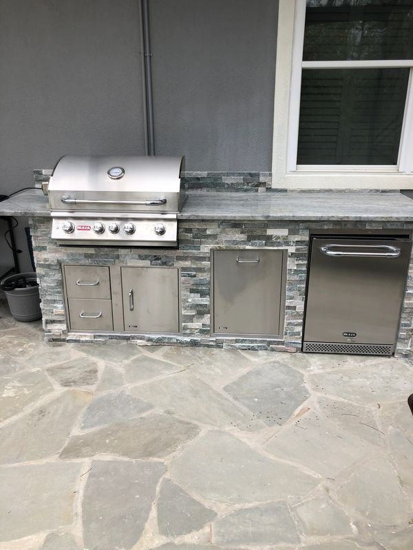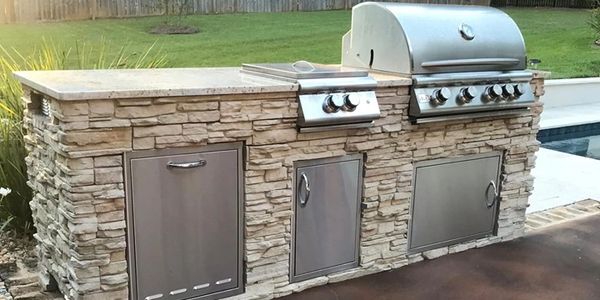 This kitchen has a Blaze NG Grill and Blaze Stainless Steel Doors, Drawers for storage. The Cabinet is wrapped in Stacked Stone.