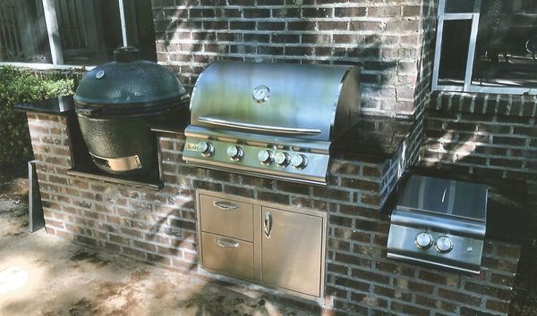 The Custom Door and Cabinets are built of Cypress. Board and Batten Cabinet has a Built-In Four Burner Grill Head and Side Burner, both by Blaze. An additional cut out was designed for our customer to add a smoker. Granite Countertops, Blaze Stainless Steel Doors and Drawers complete this outdoor living space.