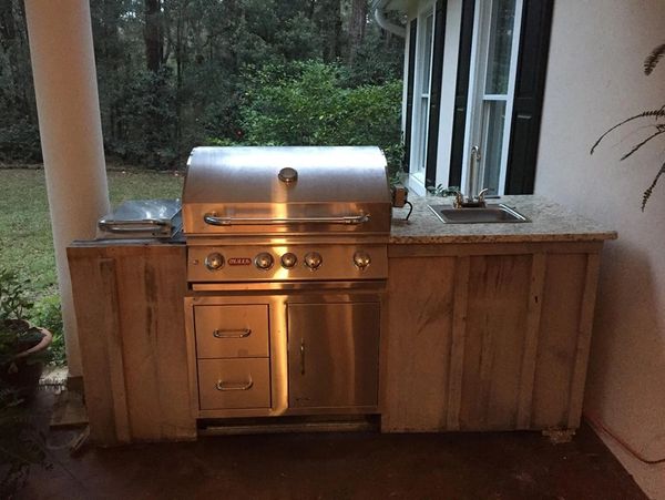 Cabinet wrapped in board and batten cypress with Blaze Stainless Steel appliances. Granite countertops with built-in NG four burner grill, side power burner, vertical door w/double drawers for storage, and an undermount sink.